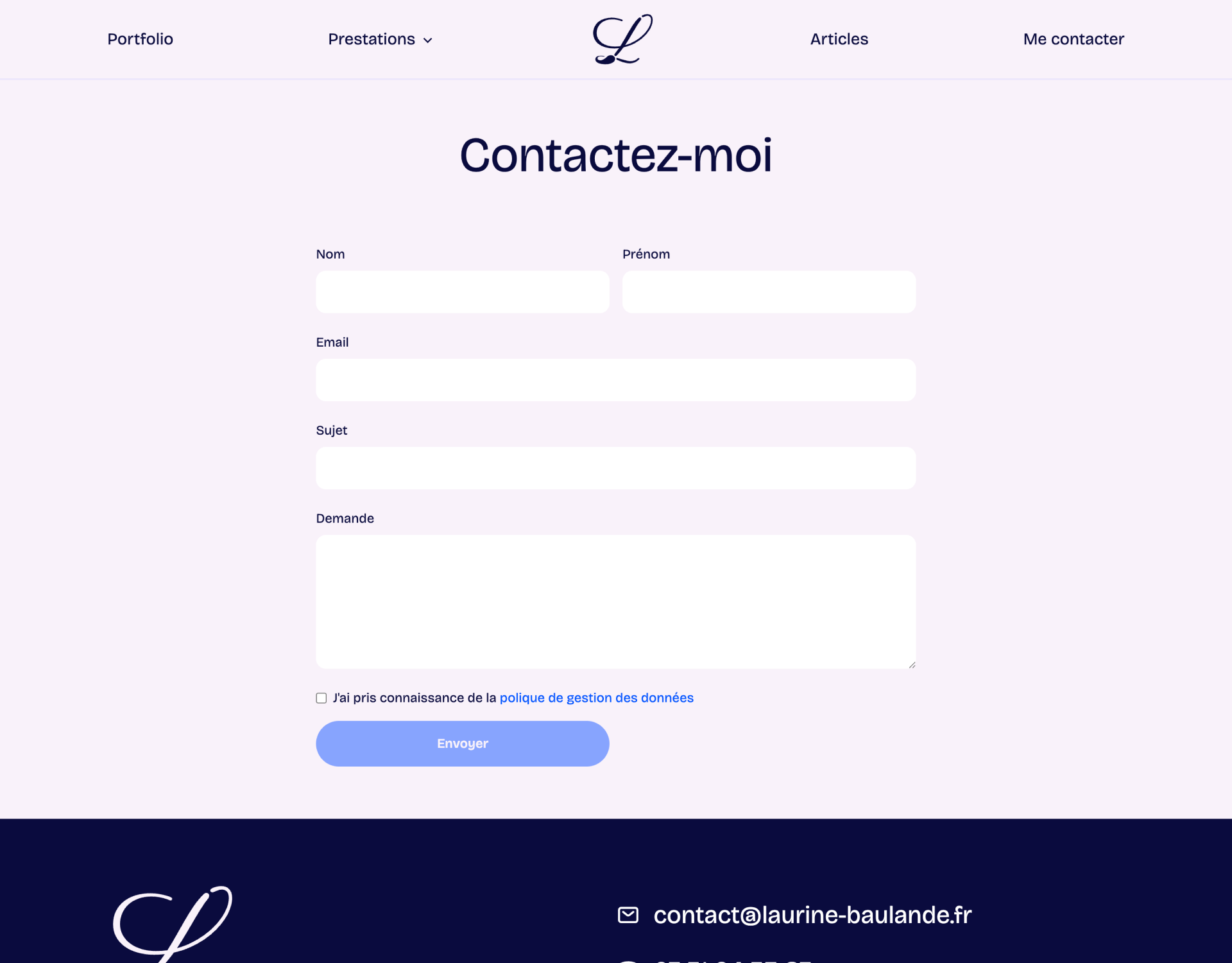 Pour le portfolio de Laurine Baulande, j’ai développé son site à partir des maquettes qu’elle avait conçues. Le site met en valeur ses compétences en tant que graphiste et illustratrice, avec une navigation fluide et une présentation claire de ses projets.